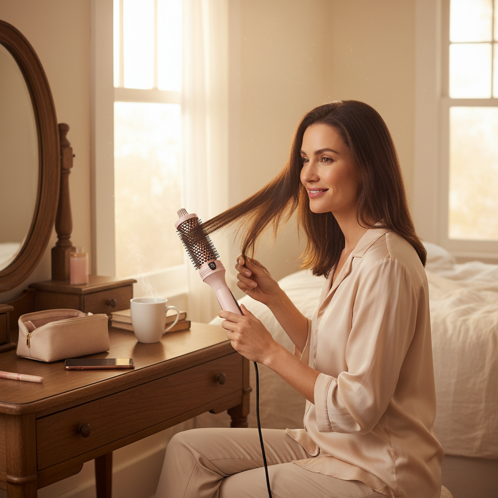 En moyenne, 10 à 15 minutes, selon la longueur et l’épaisseur — soit jusqu’à deux fois moins de temps qu’un brushing classique.